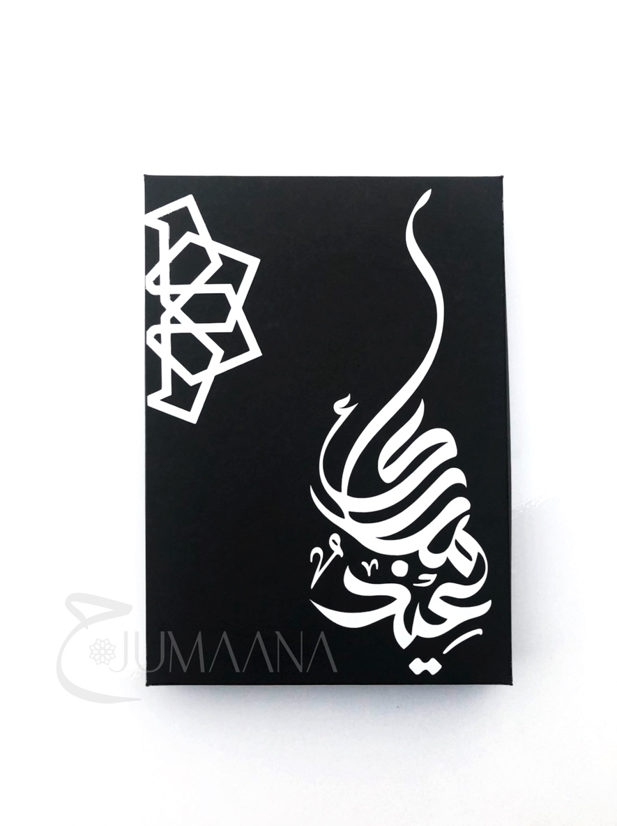 In geschnörkelter Form die arabische Aufschrift „Eid Mubarak“ und stylischem Ornament verziehrt.