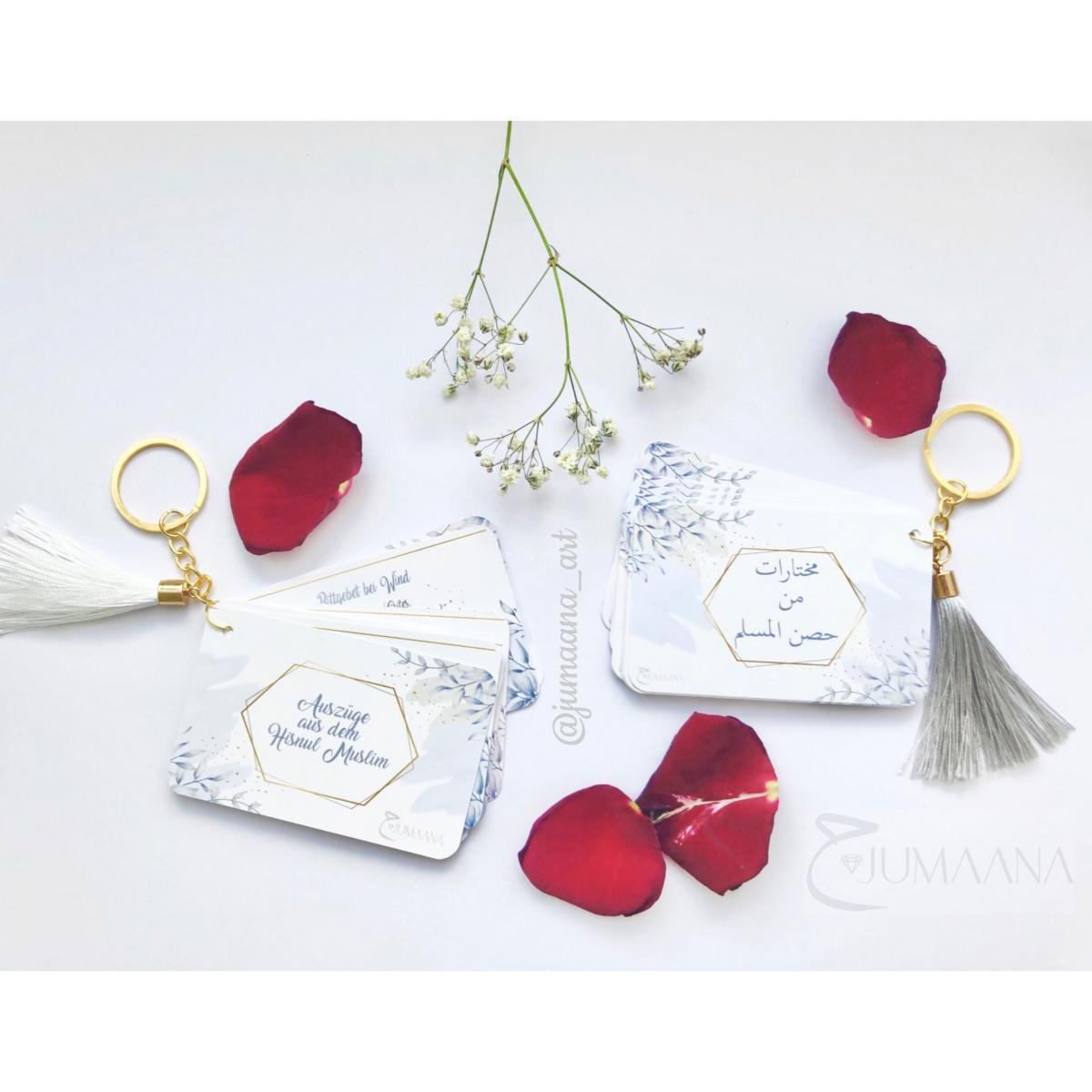 Duaa Anhänger mit wichtigen Bittgebeten für Unterwegs im ansprechendem Design und praktischen Fomat inklusive Schlüsselring und Quaste. Die beinhalteten Bittgebete sind sowohl im arabischen Original als auch in deutscher ungefährer Übersetzung bedruckt.